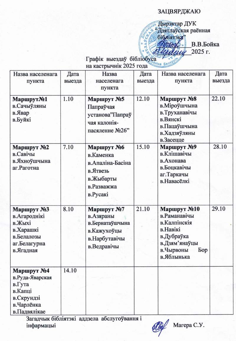 Вызначаны маршруты бібліобуса, якія зацверджаны дырэктарам ДУК “Дзятлаўская раённая бібліятэка”.