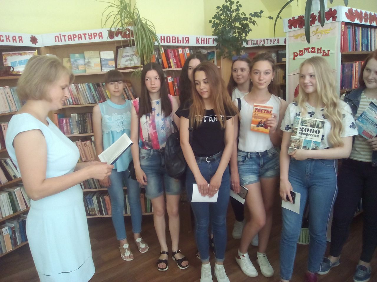 6 чэрвеня для старэйшых школьнікаў ў раённай бібліятэцы быў праведзены ўрок прафарыентацыі “Дарога ў краіну прафесій”. Бібліятэкар Магера Святлана Уладзіміраўна расказала пра прафесію бібліятэкара. Затым прайшла гутарка па наступных пытаннях: кім ты хочаш быць як вырасцеш? Што неабходна ўлічваць пры выбары прафесіі? Старшакласнікі прынялі ўдзел ў віктарыне, практыкаваліся ў конкурсе “Ён-яна”. Урок прайшоў ў ажыўлённай абстаноўцы, падлеткі былі вельмі актыўныя. Для навучэнцаў была падрыхтавана выстава-парада “Лабірынт прафесій”.
