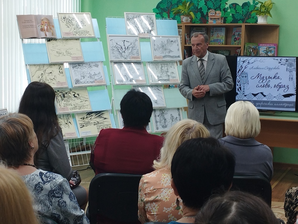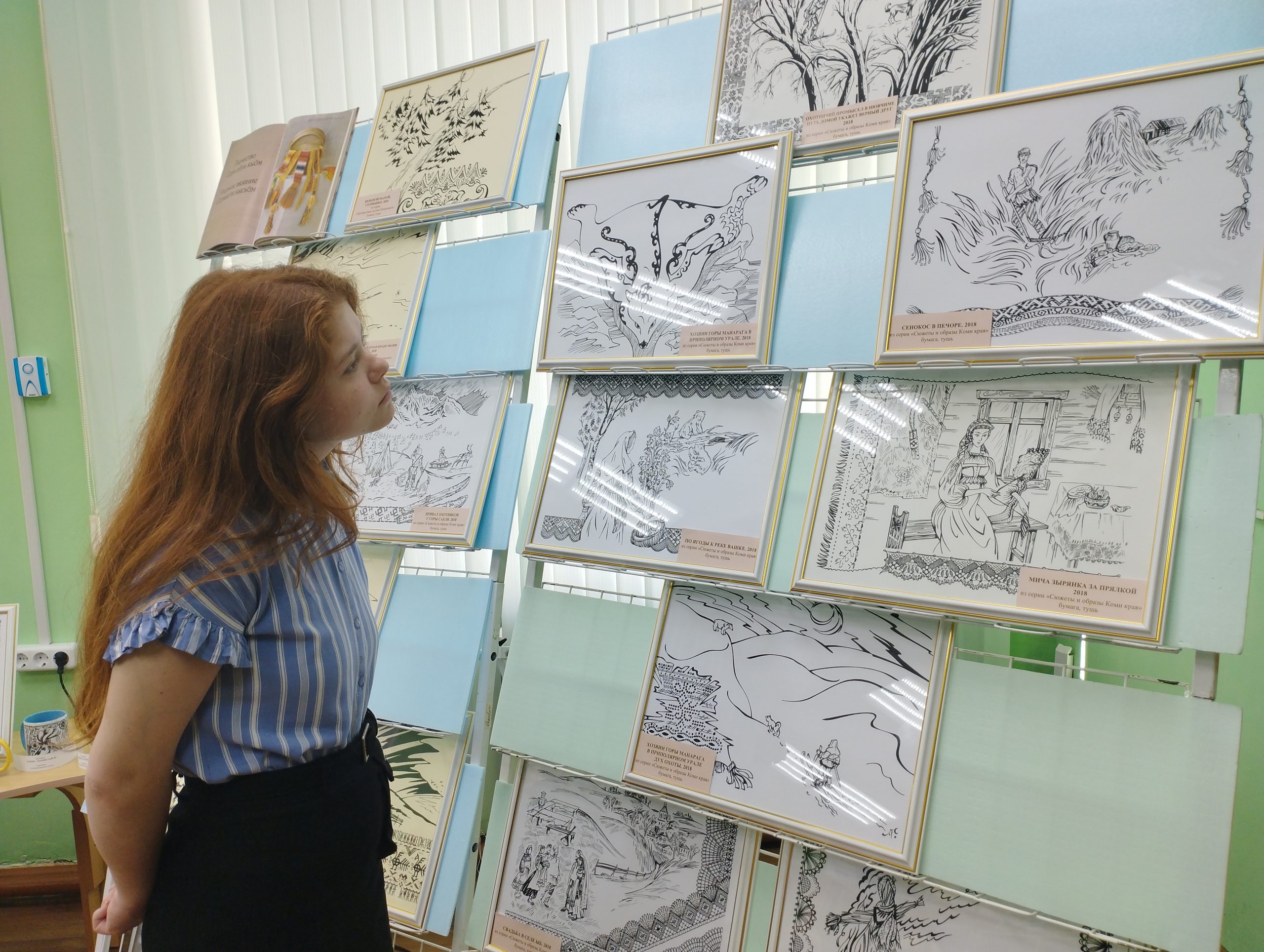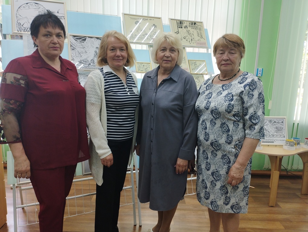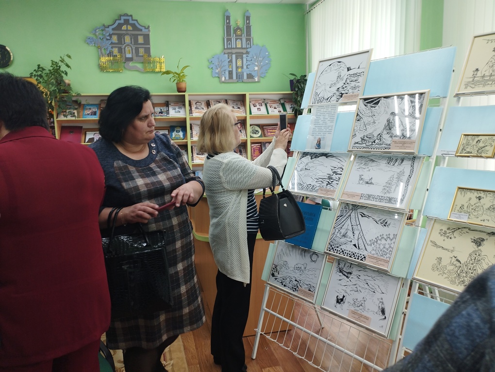 Каждая иллюстрация создана из нескольких фрагментов – центральный сюжет и орнаментальные включения. Орнамент, украшающий большинство работ, повествует о мифах, преданиях и укладе жизни народа Республики Коми. Своими впечатлениями о выставке поделились участники мероприятия — заведующий сектором культуры Василий Шитько, директор ГУО «Дятловская детская школа искусств» Алла Борисенко, читатели Раиса Лакиза и Любовь Богославчик.