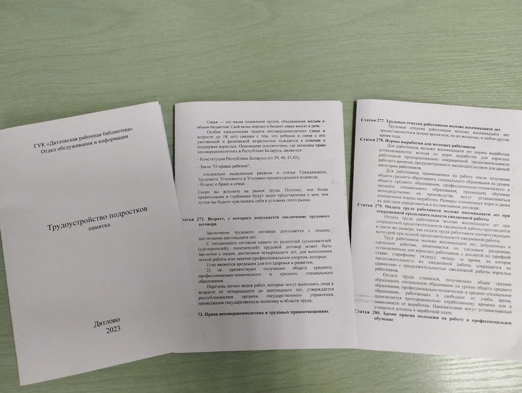У рамках бібліятэчнага праекта па прававому выхаванню “Закон і права” прайшла пазнавальная гадзіна “Працоўнае права”. У мерапрыемстве прынялі ўдзел вучні 11 класа ДУА “Гімназія №1 г. Дзятлава” з бібліятэкарам Мядзведзевай Ірынай Марʼянаўнай. Амаль хутка падлеткі адправяцца ў дарослае жыццё, таму ім было карысна пазнаёміцца з заканадаўствам Рэспублікі Беларусь па пытаннях працоўных правоў непаўналетніх, атрымаць рэкамендацыі ў складанні рэзюме пры прыёме на работу і памятку “Трудоустройство поростков”, распрацаваную бібліёграфам аддзела. Напрыканцы мерапрыемства ўдзельнікі пазнаёміліся з выставай графічных ілюстрацый А. Стручковай “Музыка, слово, образ”, якая дзейнічае ў чытальнай зале бібліятэкі.
